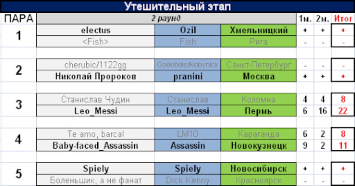 Совсем разленились люди, всего 2 пары сыграли свои матчи. cherubic и 1122gg разочаровали меня, я им давал время, но они так и не появились. Пропал Fish, не смог сыграть Боленьщик...