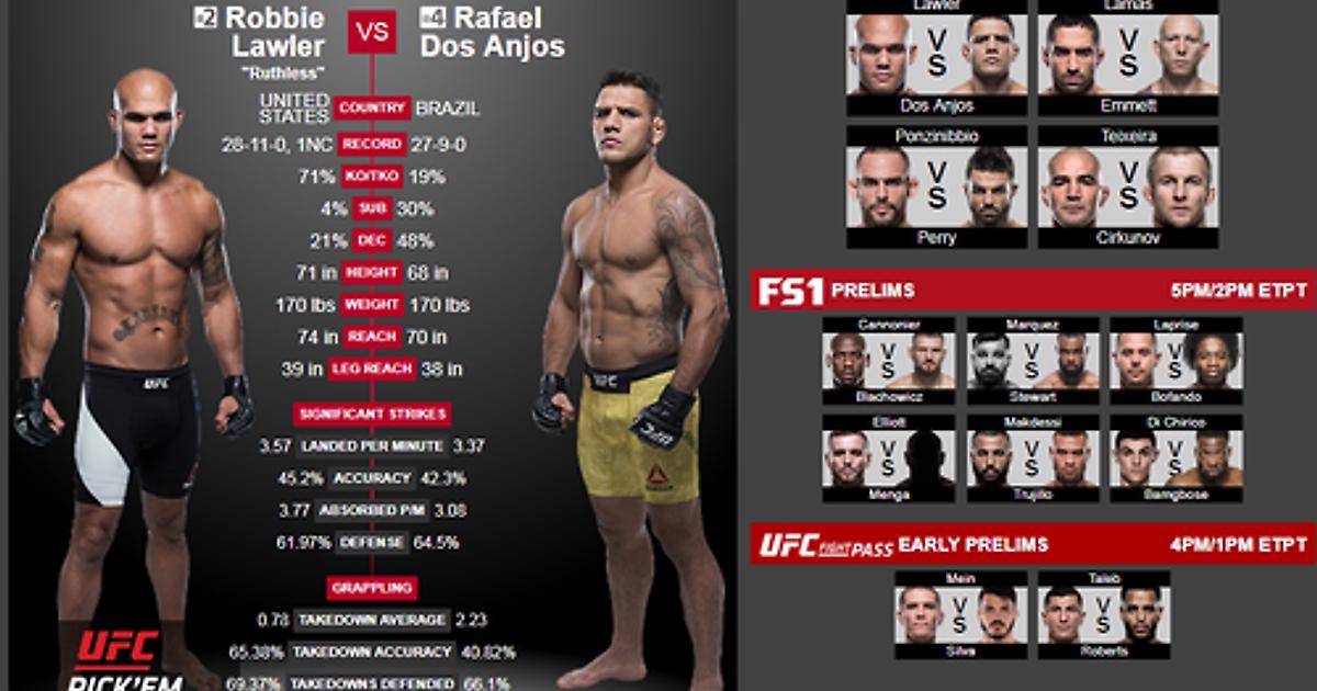 #4 Рафаэл «RDA» Дос Аньос (Бразилия, 16-7 в UFC, 2-0 в Welterweight) vs #2 Робби Лоулер (США, 13-5 в UFC), до 77 кг\ Welterweight