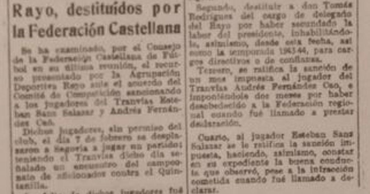 Весной 1943 года между Федерацией и Райо разгорелся серьезный конфликт. 1 апреля в газете Марка вышла статья со следующим заголовком: “Кастильская Федерация отстраняет президента и делегата Райо”. С похожим названием в заголовке 2 апреля вышла газета Гол. События, приведшие к отстранению, произошли 7 февраля. В этот день в составе Райо в матче в Сеговии вышло два игрока из команды Транвиас, которая в этот же день в рамках Чемпионата среди любителей играла против команды Куинтанилья. Комитет чемпионата узнал об этом и отстранил от игр этих двух игроков на месяц и оштрафовал Райо на 150 песет. Райо в ответ на это, с целью отмены вердикта, подал жалобу на это решение, где отрицал обвинения, ссылаясь на протокол матча и показания президента, делегата и игроков команды. Комитет приступил к расследованию. В основном благодаря показаниям одного из двух игроков Транвиас члены комитета пришли к выводу, что в составе Райо два игрока вышли на поле под фальшивыми именами. Как бы то ни было, санкции со стороны Федерации были чрезвычайно жесткими. Президент клуба Мигель Родригес Алсола был отстранён от должности и в течение пяти лет ему было запрещено занимать управляющие должности “за то, что его действия не основывались на принципе честности, которым должны следовать президенты, в полной мере отвечающие за все, что происходит в обществах, которыми они управляют”. Делегат клуба, а также фактически тренер (всё ещё без лицензии), Томас Родригес Рубио также был отстранен от должности и получил дисквалификацию на конец этого сезона и на следующий сезон целиком, так же с запретом занимать какие-либо управленческие должности “как сообщник действий президента”.