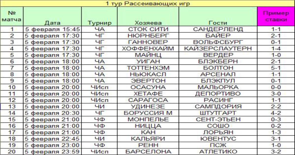 в) призванный окончательно определить состав участников и зависящую от их количества структуру и количество Дивизионов. Чтобы было все объективно и влияние случайностей было сведено к минимуму, всего в рамках рассеивающих игр будет проведено 6 туров - по 2 в каждую неделю, начная с ближайшей субботы, 5 февраля. В каждом тре будет предложено к прогнозированию по 20 матчей. Результаты туров будут складываться и в зависимости от того, сколько очков вы наберете суммарно, определится ваше место среди общего тотала (зачета) среди всех участников.