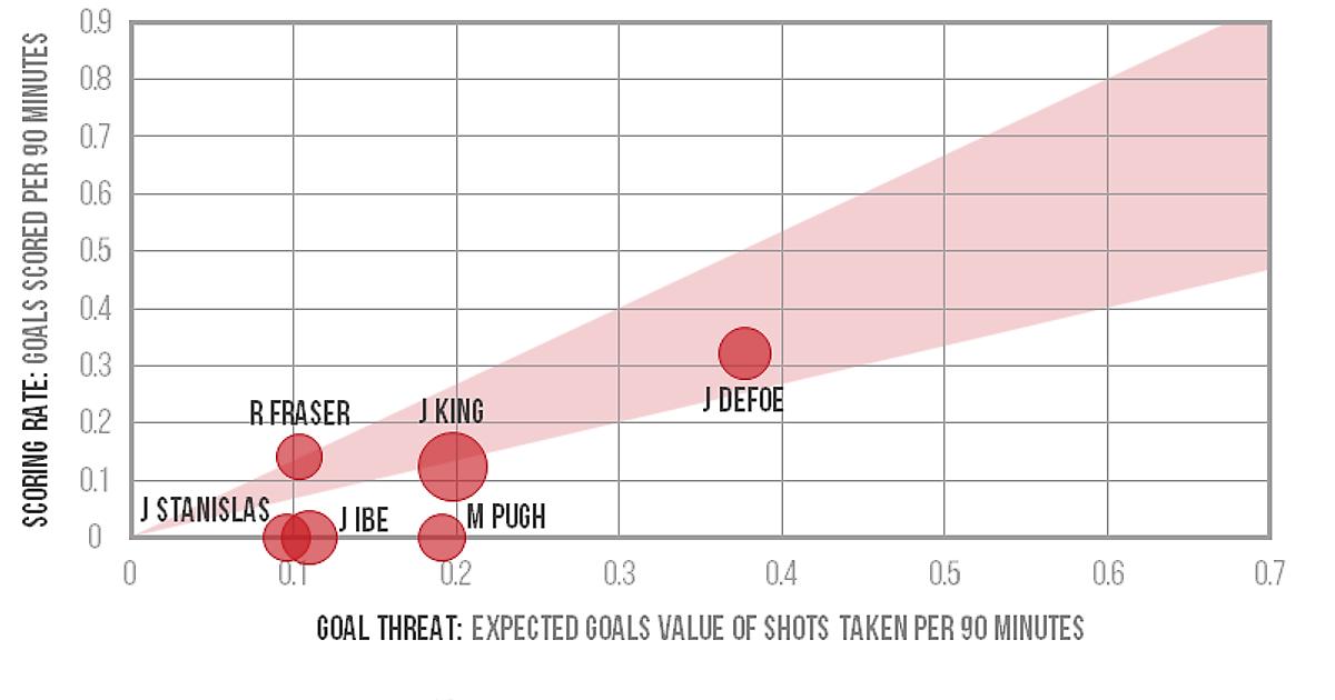На горизонтальной оси изображено значение «ожидаемых голов» после ударов, нанесенных за 90 минут.