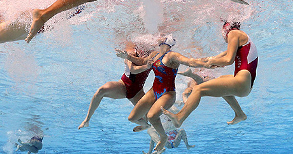 Северокорейские синхронистки разминаются на чемпионате мира в Будапеште (за черным зонтиком скрывается тренер). В итоге сборная КНДР стала 9-й.