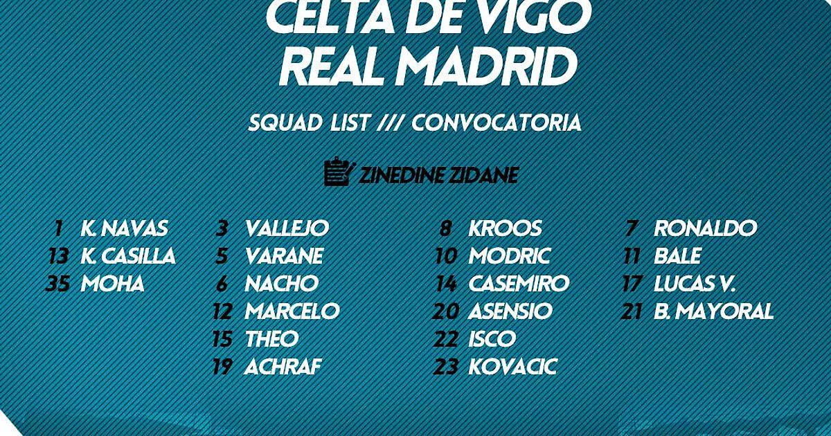 Зидан вызвал на игру 19 футболистов. В матче не сыграют дисквалифицированный Карвахаль, травмированные Рамос и Бензема, а также оставшиеся вне заявки Льоренте и Себальос.