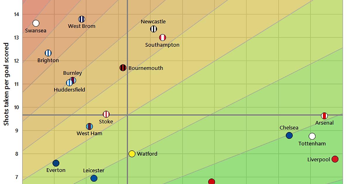 График показывает соотношение среднего количества ударов, необходимых для того, чтобы забить гол (вертикальная шкала) и среднего количества нанесенных ударов по воротам противника (горизонтальная шкала).