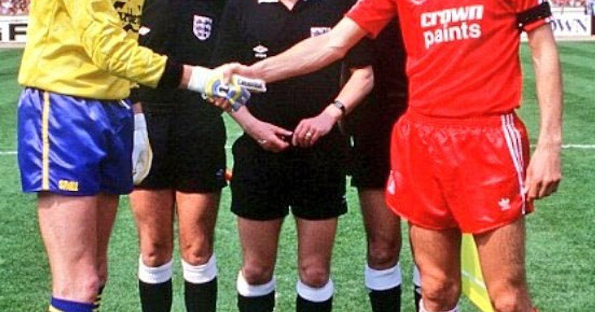 Капитаны Дэйв Бизэнт и Алан Хансен пожимают руки перед знаменитым финалом Кубка Англии между «Уимблдоном» и «Ливерпулем»