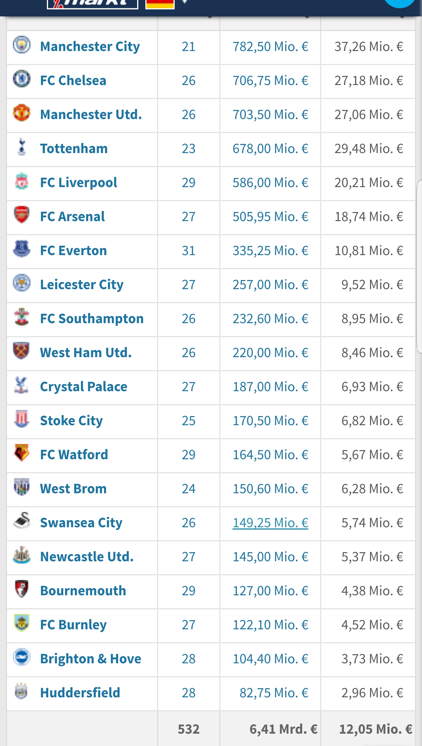 2. Уровень лиги. В Англии 20-я команда может стоить дороже ,чем команда которая ведет борьбу за Еврокубки в любой другой лиги. АПЛ является самой дорогой лигой: