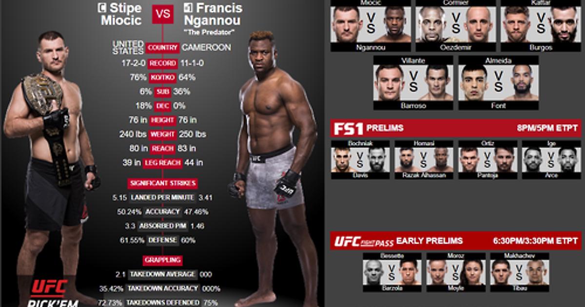 Стипе Миочич (Огайо, США; 11-2 в UFC, серия 5-0) vs Фрэнсис Нганну (Лас-Вегас, США; 6-0 в UFC), бой за титул чемпиона в весе выше 93 кг\ Heavyweight