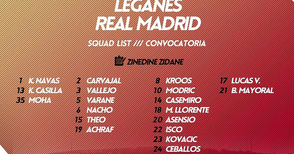 Вне заявки остались восстанавливающиеся от повреждений Рамос и Бензема, а также Марсело, Роналду и Бэйл.