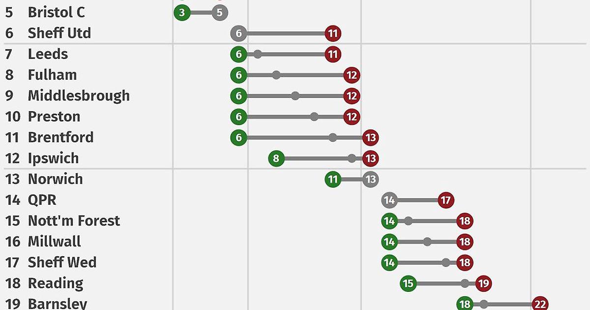 Таблица, отражающая возможные изменения в таблице Чемпионшипа после 28-го тура