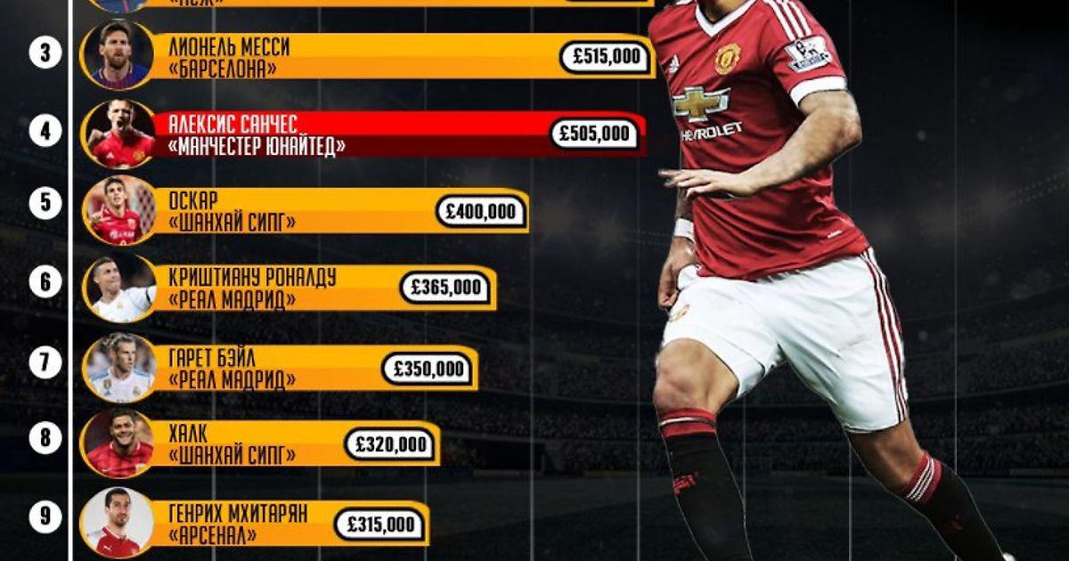 Мхитарян получает около 170 тысяч, а САНЧЕС около 250 тысяч, Роналду около 360 тысяч.
