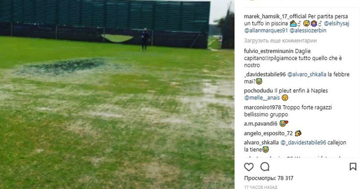 Марек Гамшик, Аллан, Эльсеид Хюсай и Алессио Дзербин скользили по воде на тренировке. Все просто: их команда проиграла в двухсторонке. В наказание проигравшие футболисты прыгают в лужу, а игроки из команды-победителя бьют по ним мячами.