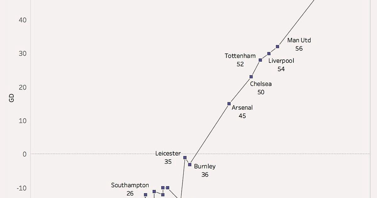 График соотношения набранных очков и разницы забитых/пропущенных мячей командами АПЛ в сезоне 2017/18