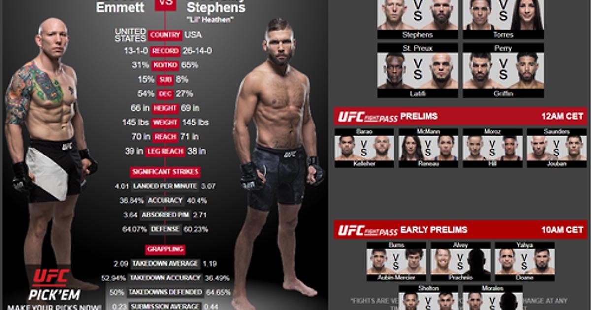 #7 Джереми Стивенс (Сан-Диего, США; 14-13 в UFC, серия 2-0) vs #4 Джош Эммет* (Финикс\Сакраменто; Team Alpha Male, США; 4-1 в UFC, 2-0 в Featherweight), до 66 кг\Featherweight
