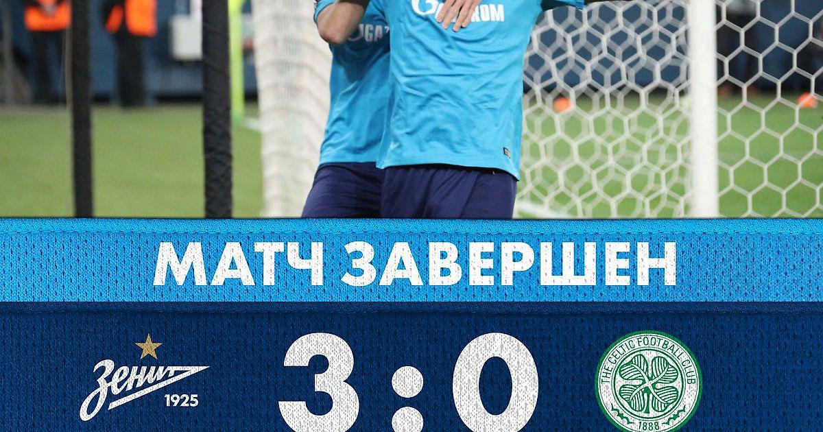 "Зенит" на своем поле в ответном матче 1/16 финала Лиги Европы разгромил "Селтик" (3:0). В составе хозяев отличились Бранислав Иванович (в свой 34-й день рождения), Далер Кузяев и Александр Кокорин.