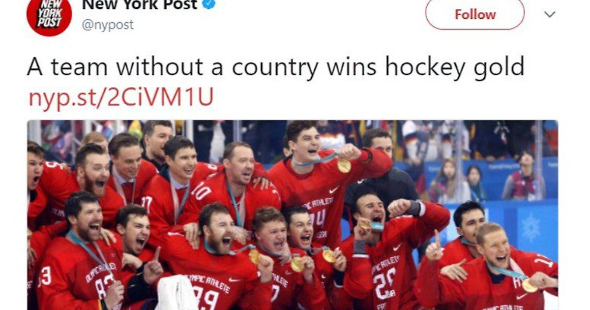 Газета New York Post сделала новость о победе российских хоккеистов на Олимпиаде с заголовком «Команда без страны выиграла Олимпийское золото».