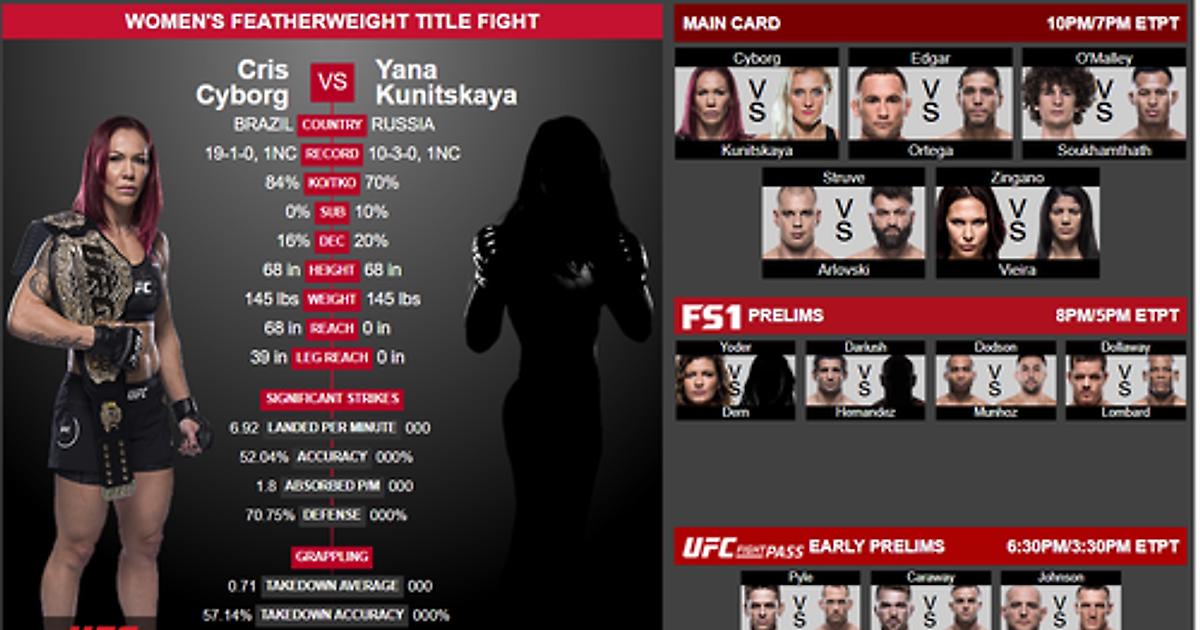 Крис «Киборг» Жюстино (Бразилия; 4-0 в UFC) vs Яна Куницкая (Россия\ Jackson Wink MMA Academy, дебют в UFC, общий рекорд 10-3), бой за титул чемпиона в весе до 66кг\ Featherweight