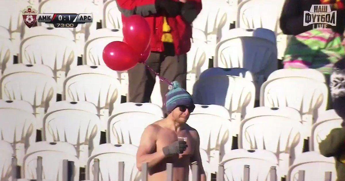 На 73-й минуте матча между «Амкаром» и «Арсеналом» оператор выхватил одного из болельщиков. Мужик стоял с голым торсом, а в руках держал стаканчик с какой-то жидкостью.