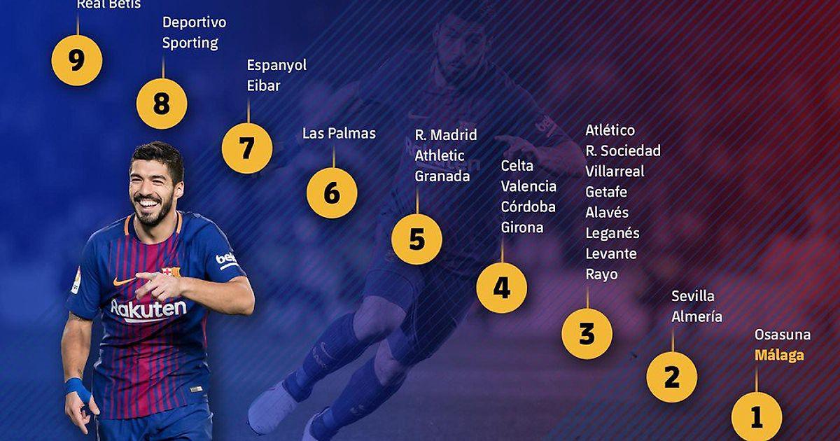 7 — «Эспаньол», «Эйбар»; 6 — «Лас-Пальмас»; 5 — «Реал», «Атлетик», «Гранада»; 4 — «Сельта», «Валенсия», «Кордоба», «Жирона»; 3 — «Атлетико», «Сосьедад», «Вильярреал», «Хетафе», «Алавес», «Леганес», «Леванте», «Райо Вальекано»; 2 — «Севилья», «Альмерия» и по одному голу Суарес забивал «Осасуне» и «Малаге».