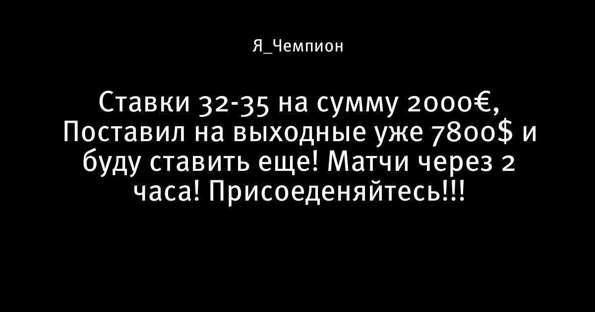 Ставки 32-35 на сумму 2000€, Поставил на выходные уже 7800$ и буду ставить еще! Матчи через 2 часа! Присоеденяйтесь!!!
