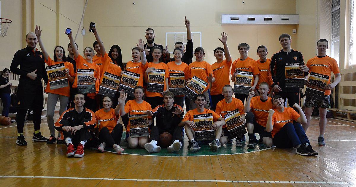 И, когда обучение основным нюансам игры закончилось, баскетболисты вместе со студентами провели небольшой товарищеский матч. А в конце мастер-класса игроки подарили всем участникам фирменные футболки и календари, а затем с удовольствием сфотографировались со всеми желающими и раздали автографы.
