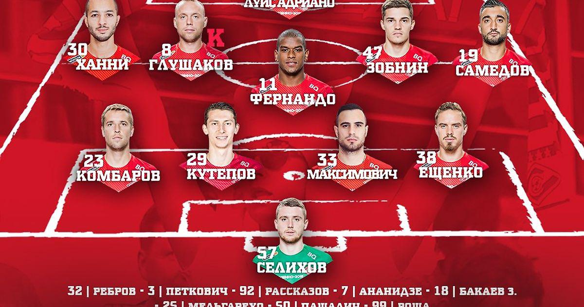 «Спартак»: Селихов, Ещенко, Кутепов, Максимович, Комбаров, Зобнин, Глушаков (к), Фернандо, Самедов, Ханни, Луис Адриано.