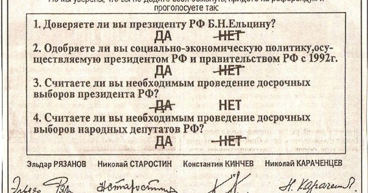 Агитационная листовка, распространявшаяся перед всероссийским референдумом в апреле 1993 года, в ходе которого всем избирателям предлагалось ответить на 4 вопроса. Главным слоганом команды действующего президента Российской Федерации Бориса Ельцина стал лозунг "Да-Да-Нет-Да": именно так агитировали голосовать различные деятели культуры, в чьих рядах затесался и Николай Старостин, основатель футбольного клуба "Спартак".