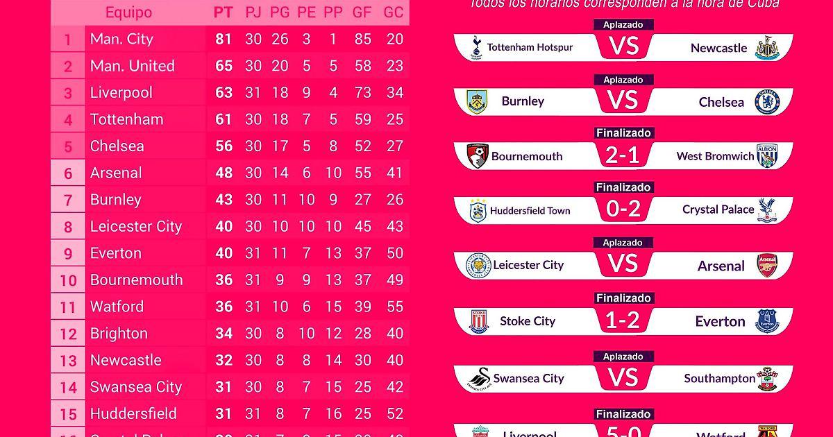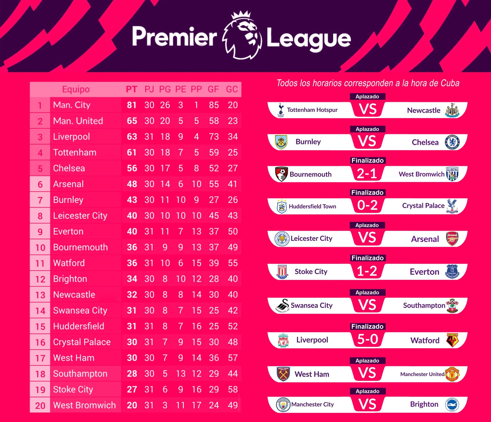 Турнирная таблица АПЛ после 31-го тура, и результаты всех матчей