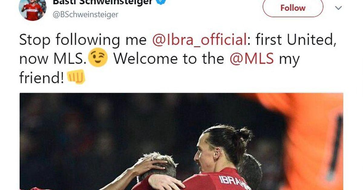 Бастиан Швайнштайгер, который выступает за «Чикаго Файр» в МЛС, отреагировал на переход Златана Ибрагимовича в американскую лигу: «Прекрати преследовать меня. Сначала «Юнайтед», теперь МЛС. Добро пожаловать в МЛС, мой друг».