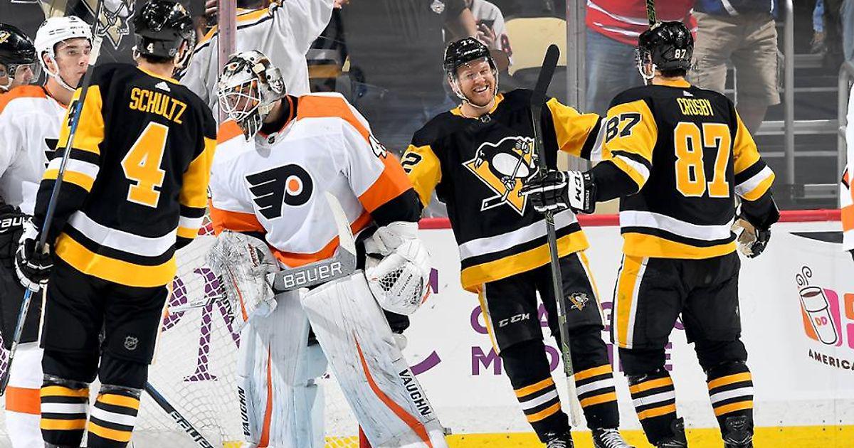 "Питтсбург Пингвинз"-"Филадельфия Флайерс" 5:4(ОТ).Брайан Раст в овертайме принёс победу хозяевам.Джастин Шульц отдал 3 результативные передачи,Сидни Кросби набрал 2 очка (1+1),Фил Кессел отдал 2 результативные передачи,Евгений Малкин забросил одну шайбу,Мэтью Мюррей отразил 41 бросок.У гостей Джордан Уил набрал 3 очка (1+2),Шейн Гостибер отдал 2 результативные передачи.