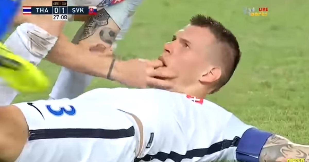 В одном из эпизодов товарищеского матча сборной Словакии и Таиланда, мяч попал Мартину Шкртелу в голову. Бывший игрок «Зенита» и «Ливерпуля» потерял сознание.