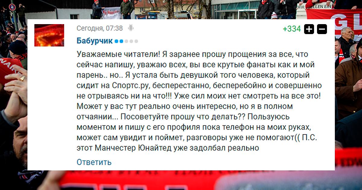 Судя по всему, пользователь Бабурчик много сидит на Sports.ru. Дошло до того, что его девушка с его же аккаунта обратилась к сообществу сайта. Она просит помощи, а еще ее задолбал «Манчестер Юнайтед». За «МЮ», судя по по профилю, болеет парень девушки – Бабурчик.