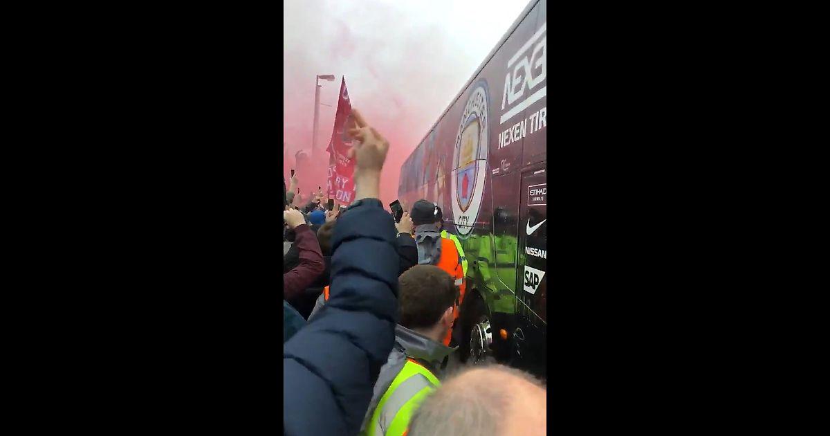 City bus arrives at Anfield. A few cans, flares and bottles thrown at it. The smashed bottle (which you can see towards the end of the vid) nearly landed on my head, which would’ve served me right tbf pic.twitter.com/NgMep0LAhP
