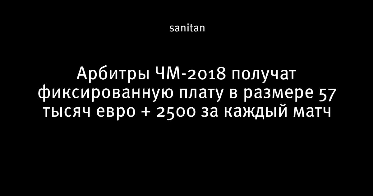 По информации UOL, главные арбитры чемпионата мира получат фиксированную плату в 57 тысяч евро. За каждый отработанный матч на турнире судьи будут получать по 2500 евро. Помощники судей заработают 20 тысяч евро и 1600 евро за каждый отработанный матч.