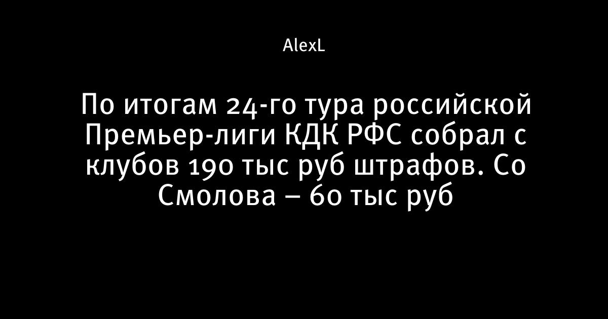 По итогам 24-го тура российской Премьер-лиги КДК РФС собрал с клубов 190 тыс руб штрафов. Со Смолова – 60 тыс руб