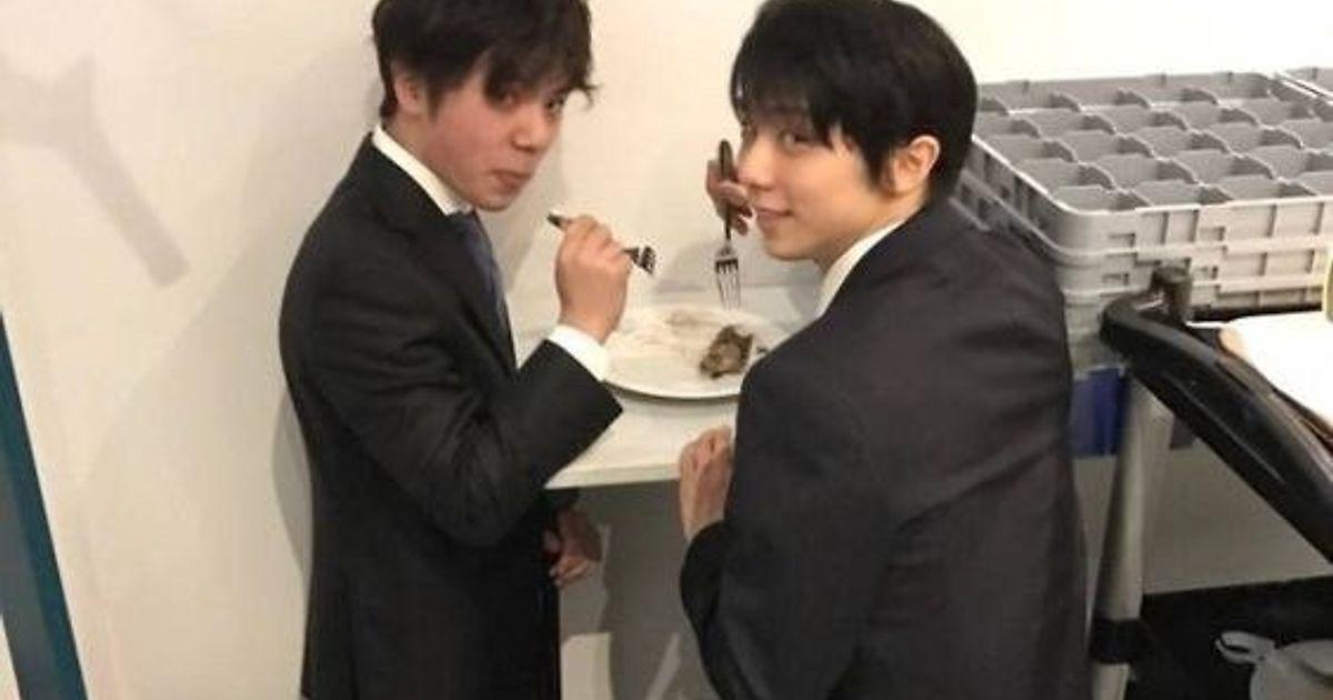 Застукали с поличным когда они хомячили! :) По-простому так, в костюмах, на полу) У Юзуру вид, как будто он стащил чей-то обед)