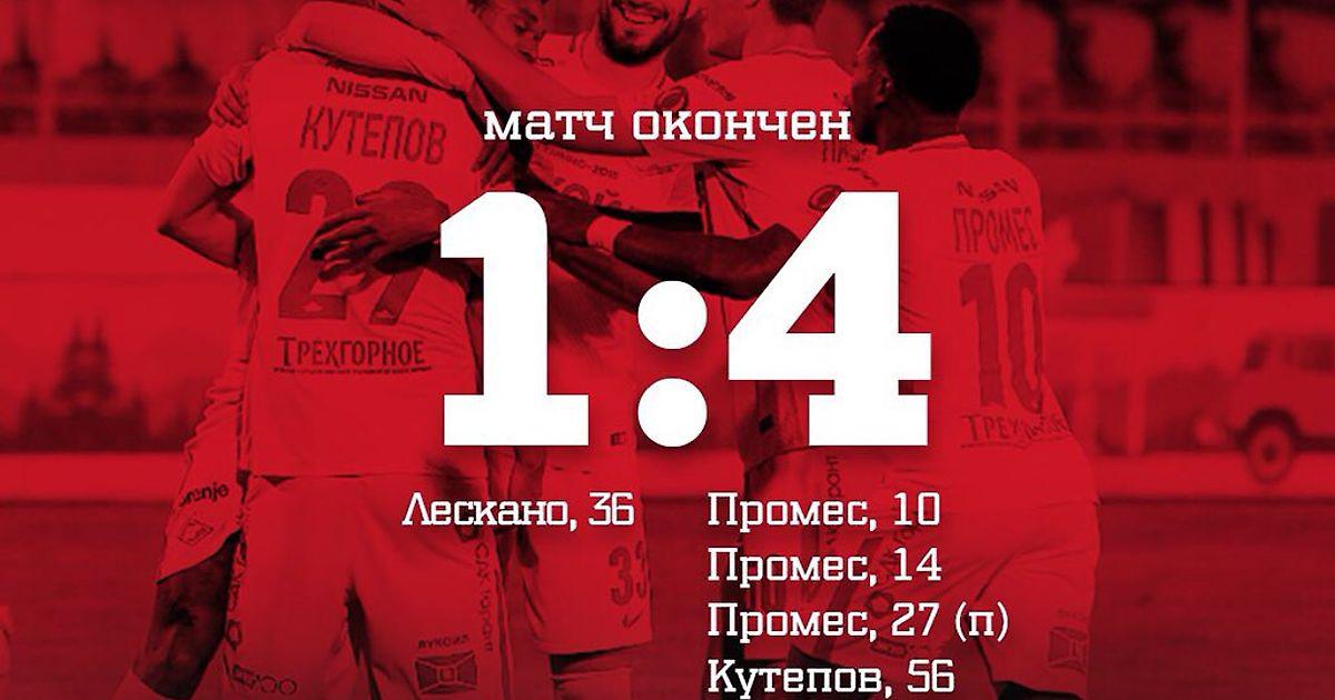 Голы: 0:1 Промес (10, Ханни, Самедов). 0:2 Промес (14). 0:3 Промес (27, пенальти, Луис Адриано). 1:3 Лескано (36). 1:4 Кутепов (56, Комбаров).