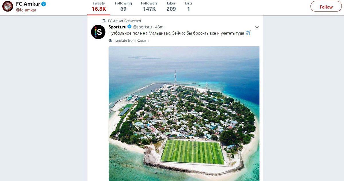 Через 5 минут после пропущенного мяча ведущий аккаунта «Амкара» ретвитнул запись о футбольном поле на Мальдивах с текстом: «Футбольное поле на Мальдивах. Сейчас бы бросить все и улететь туда».