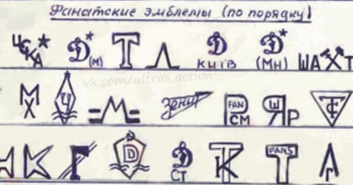 На картинке - эмблемы советских фан-движений, нарисованные ручкой и опубликованные в 1990 году в первом номере фанзина "Русский Фан-Вестник". Эти логотипы красовались на стенах домов всех городов, куда приезжали на выездные матчи представители данных движух, вызывая недоумение у местных жителей.