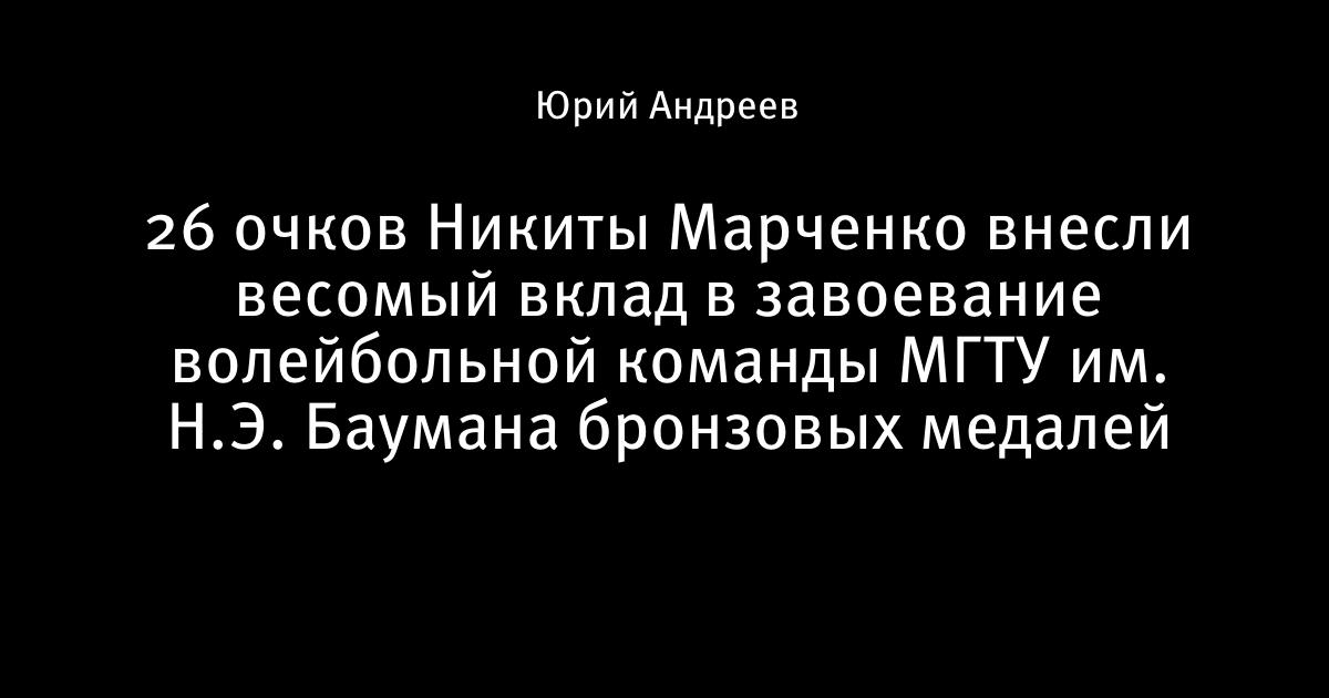 26 очков Никиты Марченко внесли весомый вклад в завоевание волейбольной команды МГТУ им. Н.Э. Баумана бронзовых медалей в «Финале 4-ёх» мужской Суперлиги, в рамках ХХХ МССИ