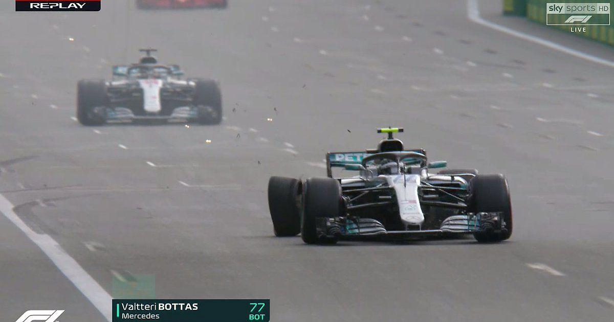 Несмотря на двойной сход, пилоты «Ред Булл» все-таки вмешались в борьбу за победу. После рестарта гонки на треке остались несколько маленьких осколков от болидов Ферстаппена и Риккардо — и как раз на один из них на главной прямой за два круга до финиша и наехал лидировавший гонщик «Мерседеса».