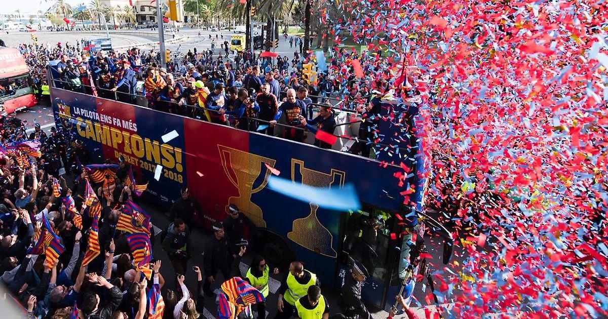 В Барселоне прошел парад в связи с чемпионством «Барселоны». Игроки каталонского клуба проехали по центральным улицам города на автобусе с открытым верхом, демонстрируя болельщикам трофей.