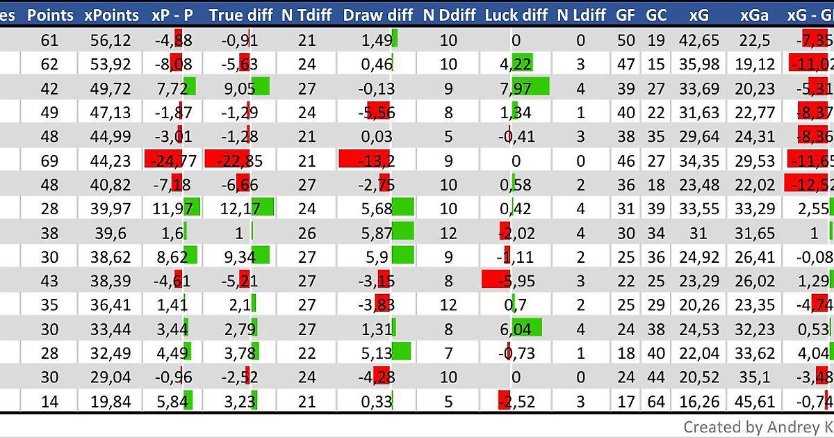 Ниже таблица ожидаемых очков xP и ожидаемых голов за прошлый сезон при Луческу. Далее будем сравнивать с итогами после 30 туров этого сезона. Небольшая подводка за предыдущие сезоны по ожидаемым очкам: