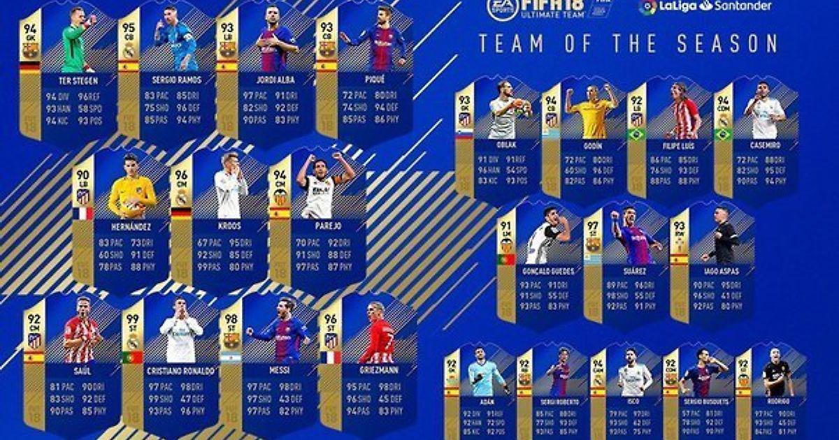 Компания EA Sports опубликовала команду сезона в чемпионате Испании. В течение недели пользователи в FIFA 18 могут получить в пакаха TOTS-карточки лучших игроков сезона. Наиболее высокие рейтинги получили нападающие Криштиану Роналду («Реал») - 99 OVR, Лионель Месси - 98 OVR и Луис Суарес - 97 OVR (Оба - «Барселона»)