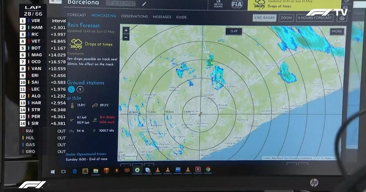 Во время Гран-при Испании телеоператор настолько близко снял один из экранов на пит-уолл с прогнозом погоды, что у зрителей получилось рассмотреть все открытые иконки на компьютерах местных аналитиков.