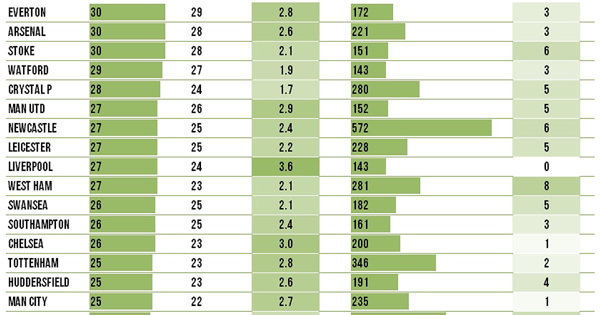 «Эвертон» выпускал на поле в этом сезоне 30 игроков (такой же показатель у «Арсенала», «Уотфорда» и «Стока»), 29 из которых как-минимум один раз выходили в стартовом составе.