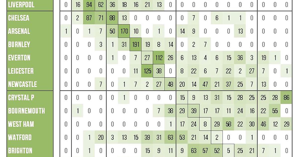Количество дней, которые клубы АПЛ провели на той или иной позиции в таблице
