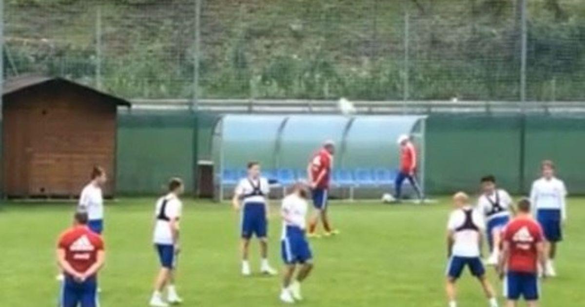 Сборная России по футболу проводит этап тренировочного сбора в Австрии.На сегодняшней тренировке (26.05.2018) во время разминки, в квадрате мяч попал к Юрию Жиркову и тот попытался эффектно совершить удар по мячу.