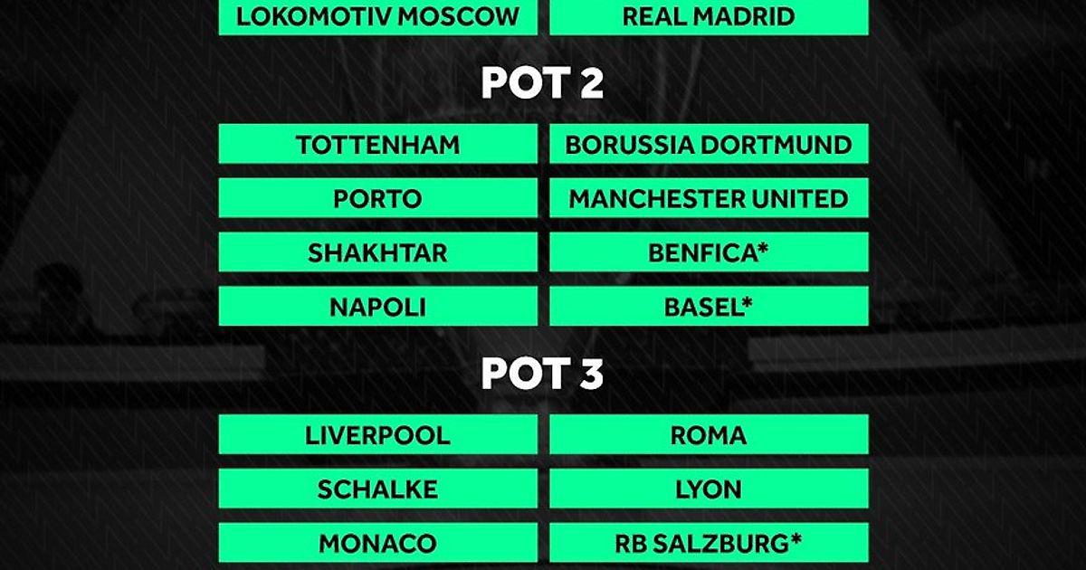 Вторая корзина: «Тоттенхэм», «Боруссия»Дортмунд, «Порту», «Манчестер Юнайтед», «Шахтер», «Бенфика» (*), «Наполи», «Базель» (*);