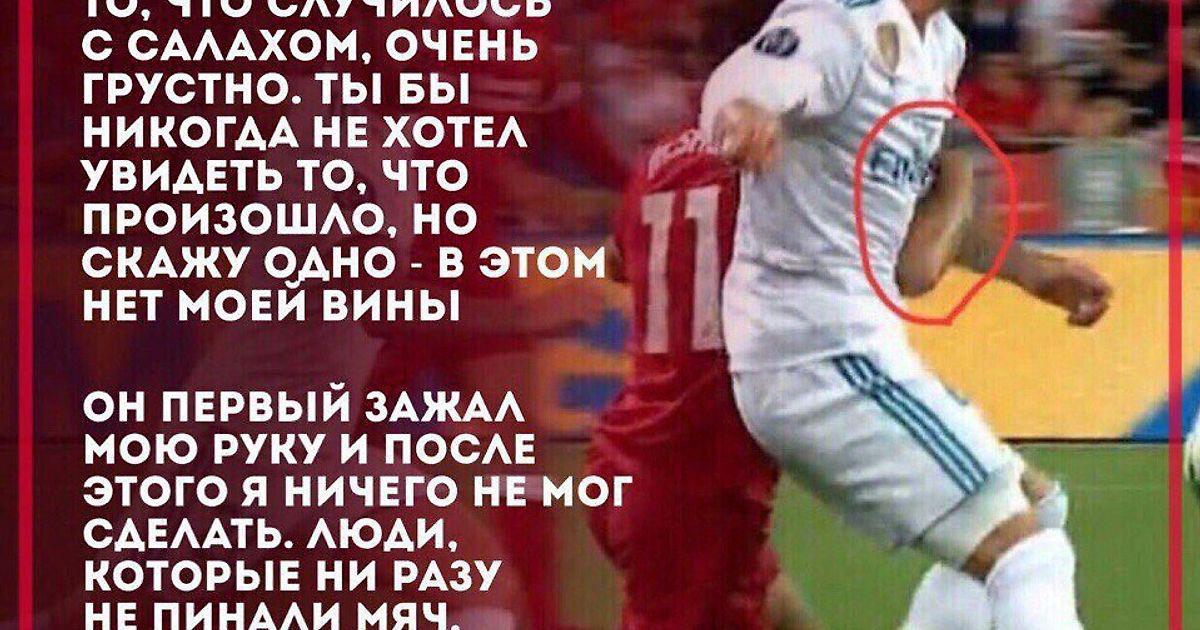 Мохамед Салах хватает локоть Рамоса и падает после единоборства (Рамос играет в мяч), своим локтём тянет за собой Серхио. Рамос, как и любой человек с здоровой нервной системой, рефлекторно выставляет руки вперёд при падении (кто-то из особенно выдающихся комментаторов предлагал Рамосу убрать свой локоть - убрать свой локоть за 2 секунды, когда его держит соперник локтём - это интересная задача). В итоге Салах проиграл единоборство, мяч, и локоть ;) З