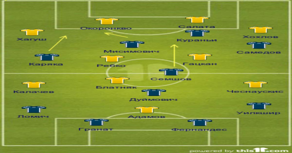 Когда счет стал 2-0, Божович решил выпустить на поле Андрея Воронина, который заменил Мисимовича, Каряку заменил Смолов. В конце матча команды играли следующим образом.